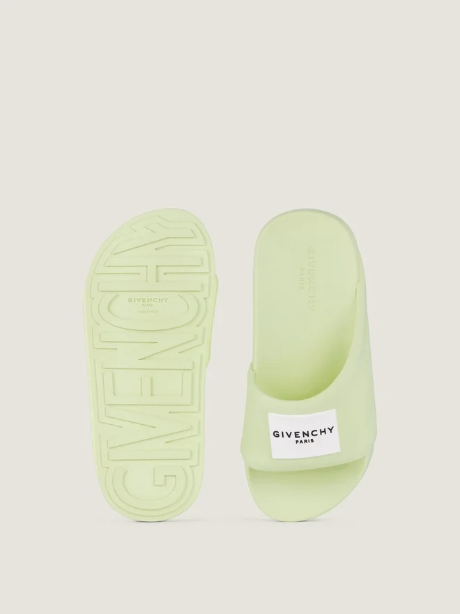 Flache Pantoletten aus Gummi. Label-Linie. Asymmetrisches Design. Givenchy Paris-Gummi-Label auf der Oberseite. Givenchy Paris-Signatur als Prägung auf