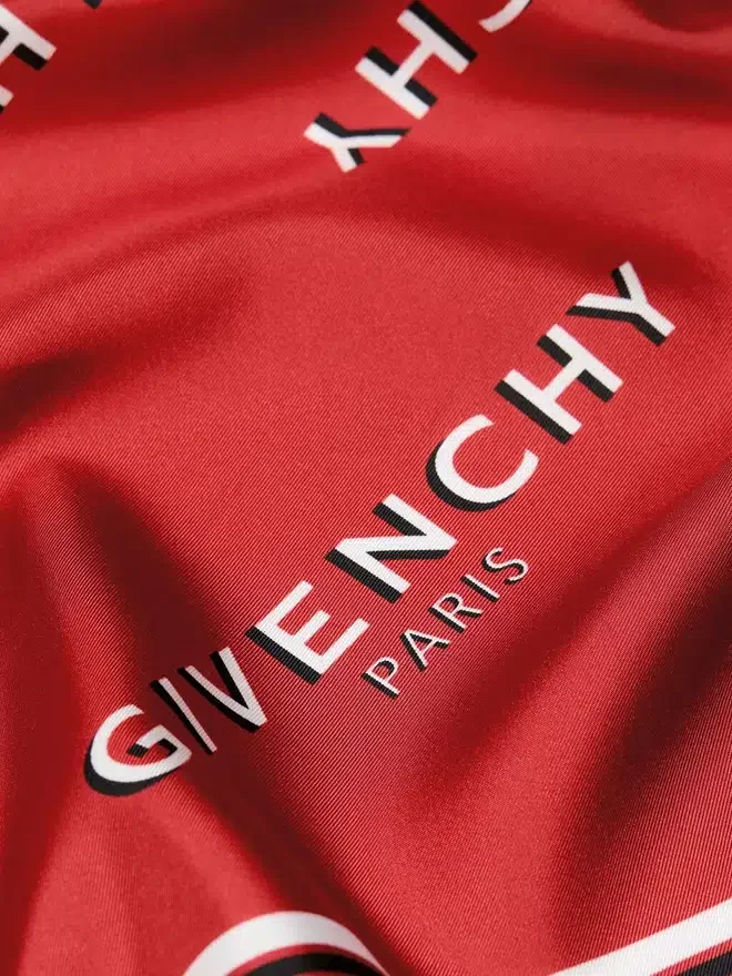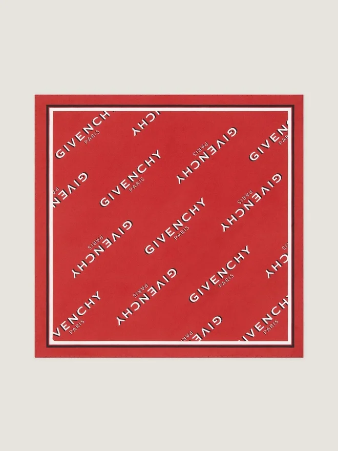 Quadratisches Tuch aus Seidentwill. Durchgehender „Shadow Signature Print“ von Givenchy Paris. Handgerollte Kanten.