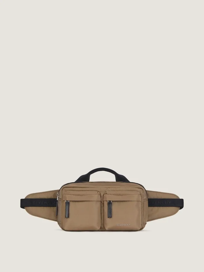 Gürteltasche aus Canvas. Essential U-Linie. Griff an der Oberseite. Reißverschluss mit Lederzuglaste. Verstellbarer Givenchy-Gurt