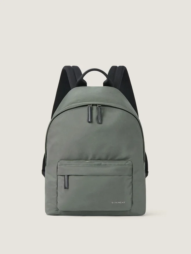 Rucksack aus Nylon. Essential U-Linie. Reißverschluss mit doppeltem Leder-Reißverschlusszug. Givenchy-Logo aus Metall auf der Vorderseite.