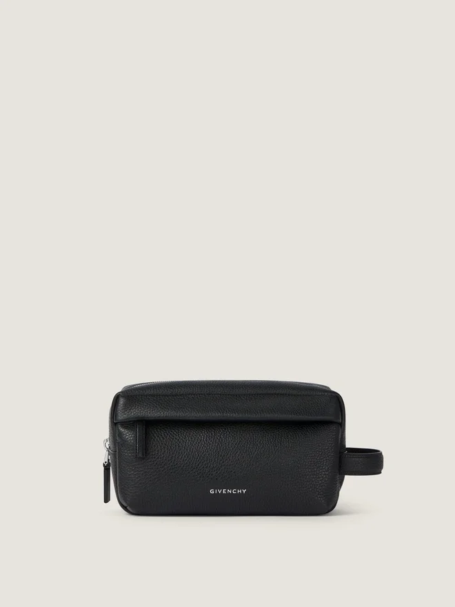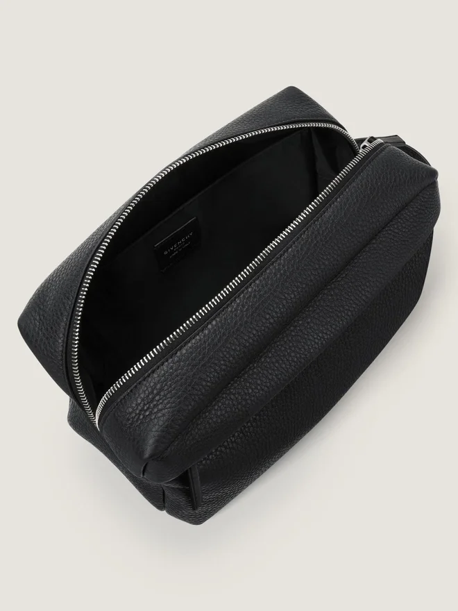 Toilettenbeutel aus genarbtem Kalbsleder. U-Rucksack-Linie. Griff an der Seite. Reißverschluss mit Lederzuglasche. Givenchy