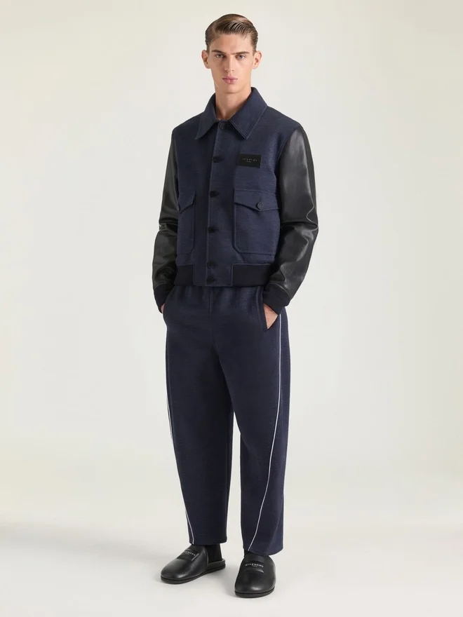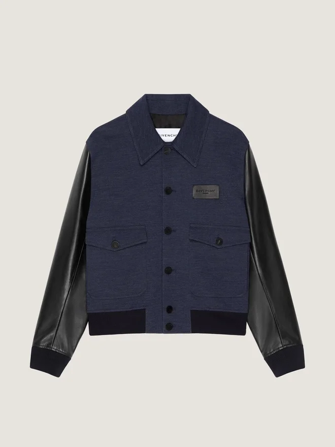 Das Givenchy-Label wird zu einem dezenten Schmuckelement, das auf die Kleidungsstücke geprägt, aufgenäht oder aufgestickt ist. Blouson aus Wolle mit Ärmeln aus Kalbsleder.Klassischer Kragen.Givenchy Paris-Lederpatch auf der Brust.Knopfverschluss.Zwei Pattentaschen vorne.Elastischer Strickbund und Ärmelbündchen.• Das Model ist 1,85 m groß und trägt Größe 48.D FarbeD SchwarzD MaterialD Ärmel: 100 % Rindsleder.D Hauptteil: 96 % Wolle, 4 % Polyamid.D Futter vorne und an den Ärmeln: 100 % Viskose.D Futter hinten: 57 % Acetat, 43 % Polyester.D FarbeD SchwarzD MaterialD Ärmel: 100 % Rindsleder.D Hauptteil: 96 % Wolle, 4 % Polyamid.D Futter vorne und an den Ärmeln: 100 % Viskose.D Futter hinten: 57 % Acetat, 43 % Polyester.D FarbeD SchwarzD MaterialD Ärmel: 100 % Rindsleder.D Hauptteil: 96 % Wolle, 4 % Polyamid.D Futter vorne und an den Ärmeln: 100 % Visk Körper: 96 % Wolle, 4 % Polyamid. Futter vorne und an den Ärmeln: 100 % Viskose. Futter hinten: 57 % Acetat, 43 % Polyester.PflegehinweiseNicht waschenNicht bügelnNicht im Wäschetrockner trocknenNicht bleichenNicht chemisch reinigenHerkunftslandItalienProduktcodeBm01F36Y47-001