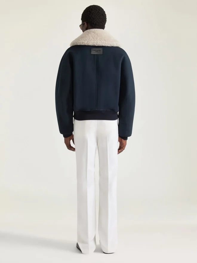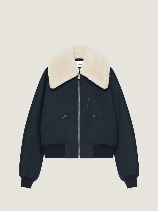 Bomberjacke aus Baumwolle. Abnehmbarer Lammfellkragen. Givenchy Paris-Lederpatch im oberen Rückenbereich. Reißverschluss mit Givenchy-Metall