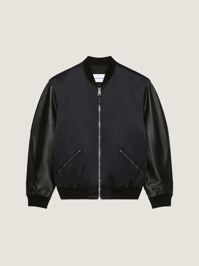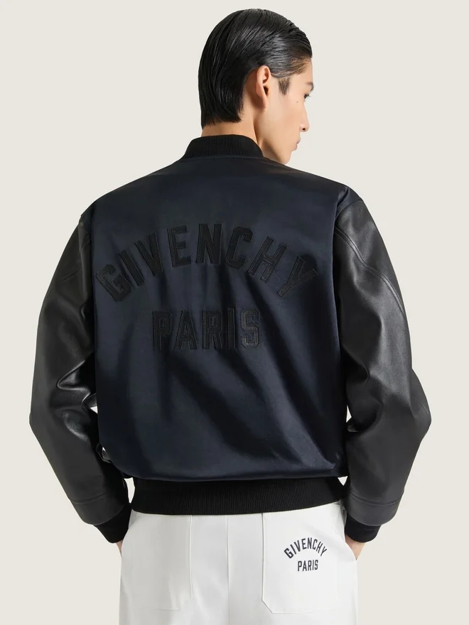 Das Givenchy Paris-Logo greift Vintage-College-Referenzen auf und interpretiert klassische Schriftzüge in subtilen, kontrastreichen und gestickten Applikationen neu.Bomberjacke aus Satin mit Ärmeln aus Nappaleder.Bomberkragen.Givenchy Paris-Lederpatch auf dem Rücken.Reißverschluss.Zwei seitliche Reißverschlusstaschen.Elastischer Strickkragen, Saum und Ärmelbündchen.Schrägnähte für einen kokonartigen Schnitt.• Lockere Passform. • Das Model ist 1,85 m groß und trägt Größe 48. Farbe Schwarz/Schwarz Material 53 % Baumwolle, 47 % Acetat. Zusatzmaterial: 100 % Lammleder. Futter: 55 % Polyester, 45 % Baumwolle.PflegehinweiseNicht waschenNicht bügelnNicht im Wäschetrockner trocknenNicht bleichenNicht chemisch reinigenHerkunftslandItalienProduktcodeBm01Dz6Y3Z-075