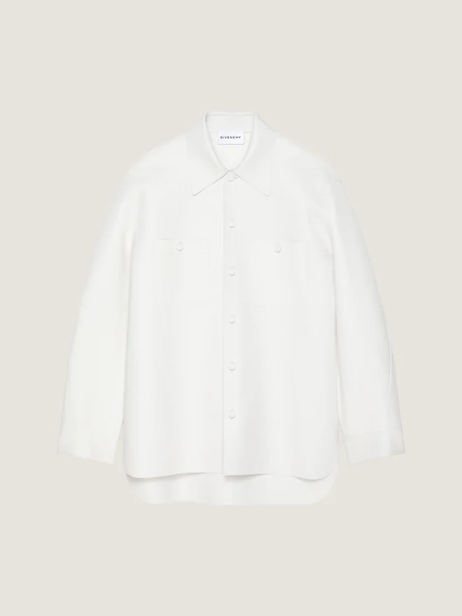 In Anlehnung an das Couture-Erbe von Givenchy ziehen sich geschwungene, umgekehrte Nähte an Ärmeln und Hosenbeinen entlang und schaffen so eine skulpturale Silhouette.Overshirt aus Nappaleder.Klassischer Kragen.Givenchy-Signatur als Prägung auf der Knopfleiste.Givenchy-Lederknöpfe.Knopfverschluss.Geknöpfte Manschetten.Zwei Brusttaschen.Schrägnähte für einen kokonartigen Schnitt. Das Model ist 1,85 m groß und trägt Größe 48. D FarbeD WeißD MaterialD 100 % LammlederD PflegehinweiseNicht waschenNicht bügelnNicht im Wäschetrockner trocknenNicht bleichenNicht chemisch reinigenHerkunftslandItalienArtikelnummerBm01Da61Tk-100 Pflegehinweise: In unseren Werkstätten entwerfen wir mutig und kreativ einzigartige Kleidungsstücke aus hochwertigen Materialien. Um den Glanz Ihres Givenchy-Produkts zu bewahren, empfehlen wir, es in einem Staubbeutel aus Baumwolle an einem trockenen, kühlen Ort aufzubewahren. Für die meisten unserer Produkte wird eine chemische Reinigung empfohlen. Bitte beachten Sie unbedingt die Pflegehinweise auf dem Etikett Ihres Artikels. Besuchen Sie gerne unsere spezielle Seite oder wenden Sie sich direkt an unsere Givenchy-Teams, wenn Sie weitere Informationen wünschen.- Nicht waschen- Nicht bügeln- Nicht im Wäschetrockner trocknen- Nicht bleichen- Nicht chemisch reinigen