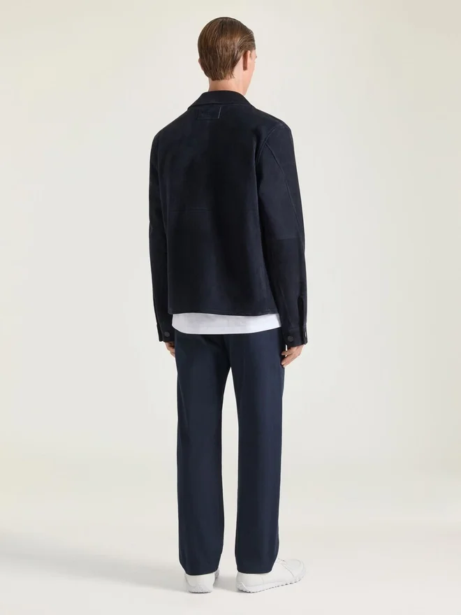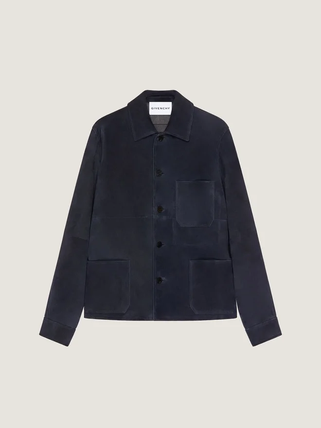 In Anlehnung an das Couture-Erbe von Givenchy verlaufen die geschwungenen, umgekehrten Nähte entlang der Ärmel und Hosenbeine und schaffen so eine skulpturale Silhouette. Langärmliges Overshirt aus Lammveloursleder. Klassischer Kragen. Givenchy Paris-Patch im oberen Rückenbereich. Knopfverschluss. Eine Brusttasche. Zwei Vordertaschen.Couture-Nähte für eine abgerundete Silhouette. Locker sitzende Passform. Das Model ist 1,85 m groß und trägt Größe 48. D FarbeD DunkelblauD MaterialD 100 % LammlederD PflegehinweiseNicht waschenNicht bügelnNicht im Wäschetrockner trocknenNicht bleichenNicht chemisch reinigenHerkunftslandItalienProduktcodeBm01Fs61X1-499