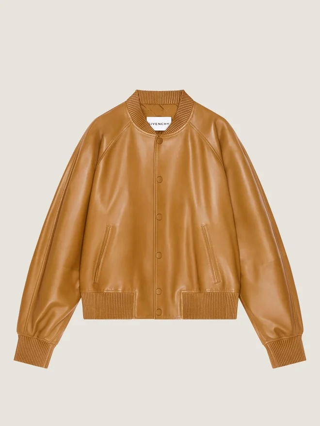 Das Givenchy-Label wird zu einer dezenten Verzierung, die auf die Kleidungsstücke geprägt, aufgenäht oder gestickt ist. In Anlehnung an das Couture-Erbe von Givenchy ziehen die geschwungenen, umgekehrten Nähte sich über Ärmel und Hosenbeine und schaffen so eine skulpturale Silhouette.Blouson komplett aus Plonge-Lammleder.Bomberkragen.Givenchy Paris-Lederpatch im oberen Rückenbereich.Druckknopfverschluss.Mit Leder bezogene Knöpfe.Raglanärmel.Zwei Seitentaschen.Kragen, Saum und Ärmelbündchen aus geripptem Stretchleder. Couture-Nähte für eine abgerundete Silhouette. Lockere Passform. Gepolstertes Futter.Das Model ist 1,85 m groß und trägt Größe 48.D FarbeD HaselnussbraunD MaterialD 100 % Lammleder. Füllung: 100 % Polyester. Futter: 100 % Viskose.D PflegehinweiseNicht waschenNicht bügelnNicht im Wäschetrockner trocknenNicht bleichenNicht chemisch reinigenHerkunftslandItalienProduktcodeBm01Fq6Y46-231