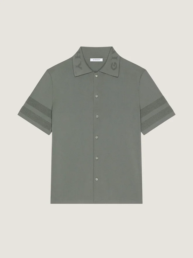 Kurzärmeliges Hemd aus Baumwollstrick.Klassischer Kragen.Givenchy-Jacquard am Kragen.Knopfverschluss.Perlmuttknöpfe. Mesh-Details an den Ärmeln. PflegehinweiseNicht waschenBei maximaler Bügeleisentemperatur (110 °C) ohne Dampf bügelnNicht im Wäschetrockner trocknenNicht bleichenChemische Reinigung mit Perchlorethylen und Kohlenwasserstoffen, SchonwaschgangHerkunftslandItalienProduktcodeBm617H4Ypa-349 Pflegehinweise: In unseren Werkstätten entwerfen wir mutig und kreativ einzigartige Kleidungsstücke aus hochwertigen Materialien.Um den Glanz Ihres Givenchy-Produkts zu bewahren, empfehlen wir, es in einem Staubbeutel aus Baumwolle an einem trockenen, kühlen Ort aufzubewahren. Für die meisten unserer Produkte wird eine chemische Reinigung empfohlen. Bitte beachten Sie unbedingt die Pflegehinweise auf dem Etikett Ihres Artikels. Besuchen Sie gerne unsere spezielle Seite oder wenden Sie sich direkt an unsere Givenchy-Teams, wenn Sie weitere Informationen wünschen.Nicht waschenBei maximaler Bügeleisentemperatur (110 °C) ohne Dampf bügelnNicht im Wäschetrockner trocknenNicht bleichenChemische Reinigung mit Perchlorethylen und Kohlenwasserstoffen, Schonprogramm