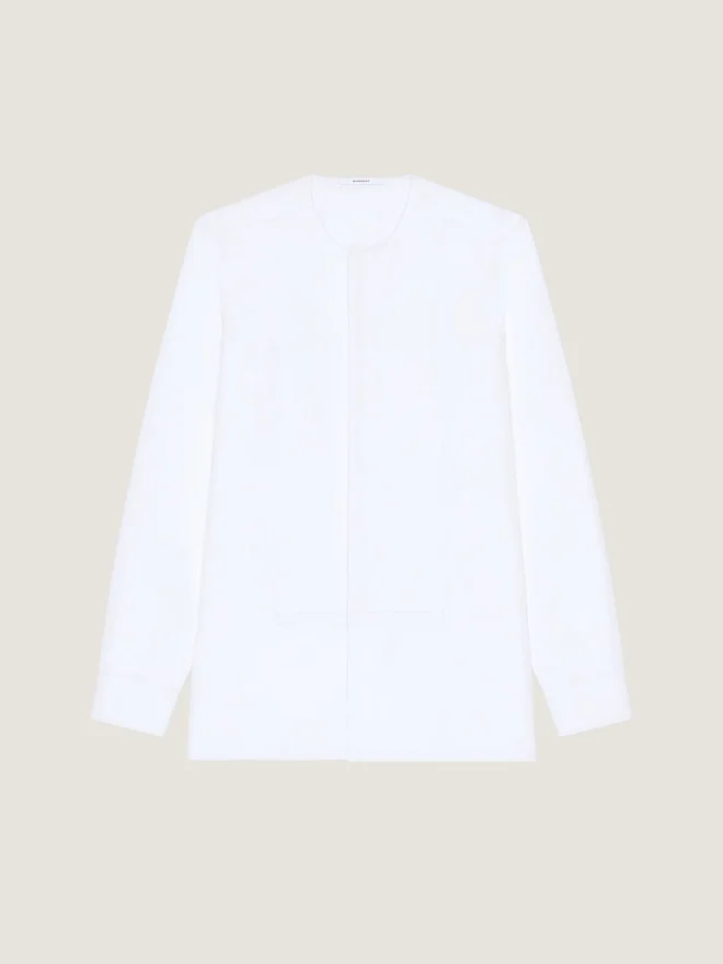 Langärmliges kragenloses Hemd aus Baumwollpopeline.Plastron auf der Vorderseite.Givenchy Paris Gros Grain im oberen Rückenbereich.Verdeckter Knopfverschluss.Geknöpfte Manschetten.