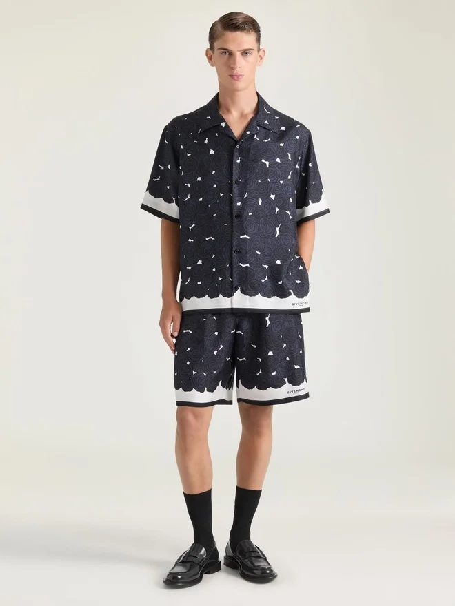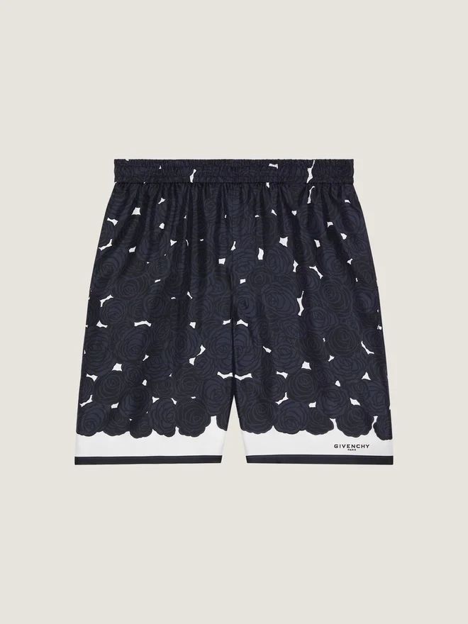 Dieser Blumenprint, der einem Schal aus dem Archiv von Hubert de Givenchy entstammt, greift das Erbe des Hauses in zeitgenössischen grafischen Formen wieder auf. Bermudashorts aus Seide mit Blumenprint. Elastischer Bund mit Kordelzug. Kleiner Givenchy Paris-Schriftzug auf der unteren Vorderseite. Zwei Seitentaschen.Eine Gesäßtasche. Das Model ist 1,85 m groß und trägt Größe 48. FarbeDunkelblauMaterial100 % Seide.PflegehinweiseNicht waschenBei maximaler Bügeleisentemperatur (110 °C) ohne Dampf bügelnNicht im Wäschetrockner trocknenNicht bleichenChemische Reinigung mit Perchlorethylen und Kohlenwasserstoffen, SchonwaschgangHerkunftslandItalienProduktcodeBm51Mt16Dn-499 Pflegehinweise: Unsere Ateliers entwerfen mutig und kreativ einzigartige Kleidungsstücke aus hochwertigen Materialien.Um den Glanz Ihres Givenchy-Produkts zu bewahren, empfehlen wir, es in einem Staubbeutel aus Baumwolle an einem trockenen, kühlen Ort aufzubewahren. Für die meisten unserer Produkte wird eine chemische Reinigung empfohlen. Bitte beachten Sie unbedingt die Pflegehinweise auf dem Etikett Ihres Artikels. Besuchen Sie gerne unsere spezielle Seite oder wenden Sie sich direkt an unsere Givenchy-Teams, wenn Sie weitere Informationen wünschen.Nicht waschenBei maximaler Bügeleisentemperatur (110 °C) ohne Dampf bügelnNicht im Wäschetrockner trocknenNicht bleichenChemische Reinigung mit Perchlorethylen und Kohlenwasserstoffen, Schonprogramm