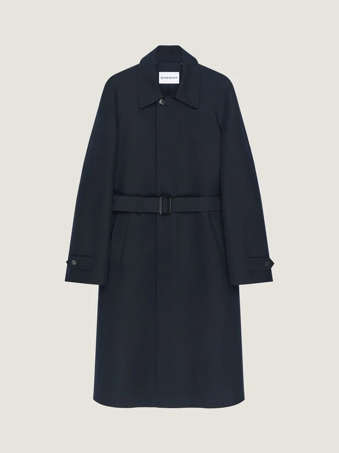 Car Coat aus doppelseitiger Baumwolle. Klassischer Kragen. Givenchy Paris-Lederpatch im oberen Rückenbereich. Knopfverschluss und Gürtel.