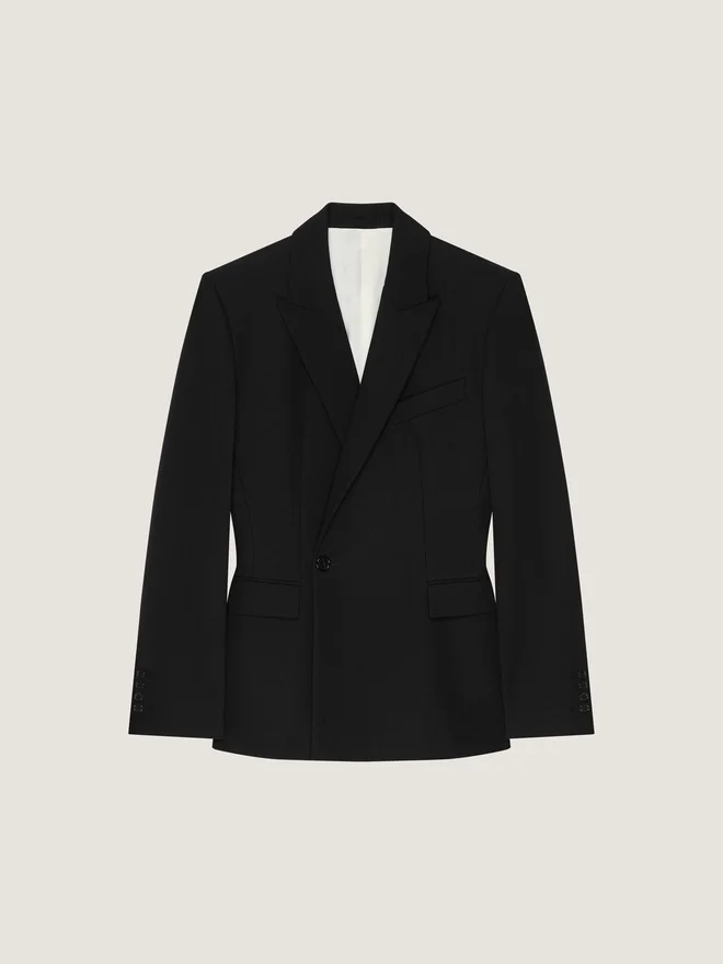 Strukturierte Jacke aus Wolle „Grain De Poudre“. Asymmetrisches Spitzrevers. Einreihig. Geknöpfte Manschetten. Eine Brusttasche. Zwei Vordertaschen