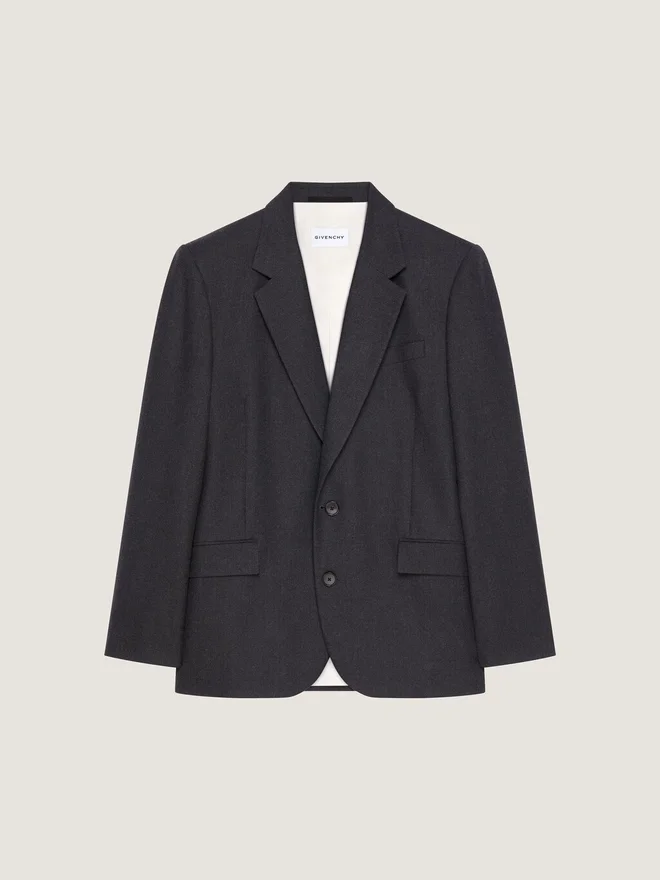 Eine gerade Silhouette mit Regular Fit und klarer Taillenlinie, die Struktur und Modernität in Einklang bringt. Strukturierte Jacke aus Wollflanell. fallendes Revers. Grosgrain-Detail am Halsausschnitt. Knopfverschluss. Geknöpfte Manschetten.Eine Brusttasche. Zwei Pattentaschen vorne. Futter aus Baumwolle. Das Model ist 1,85 m groß und trägt Größe 48. Farbe: Anthrazit Material: 100 % Wolle. Futter: 100 % Baumwolle.PflegehinweiseNicht waschenBei maximaler Bügeleisentemperatur (110 °C) ohne Dampf bügelnNicht im Wäschetrockner trocknenNicht bleichenProfessionelle chemische Reinigung mit Tetrachlorethylen und Kohlenwasserstoffen, sehr schonende BehandlungHerkunftslandItalienProduktcodeBm30Jg1646-025 Pflegehinweise: Unsere Werkstätten entwerfen mutig und kreativ einzigartige Kleidungsstücke, die aus hochwertigen Materialien gefertigt werden.Um den Glanz Ihres Givenchy-Produkts zu bewahren, empfehlen wir, es in einem Staubbeutel aus Baumwolle an einem trockenen, kühlen Ort aufzubewahren. Für die meisten unserer Produkte wird eine chemische Reinigung empfohlen. Bitte beachten Sie unbedingt die Pflegehinweise auf dem Etikett Ihres Artikels. Besuchen Sie gerne unsere spezielle Seite oder wenden Sie sich direkt an unsere Givenchy-Teams, wenn Sie weitere Informationen wünschen.Nicht waschenBei maximaler Bügeleisentemperatur (110 °C) ohne Dampf bügelnNicht im Wäschetrockner trocknenNicht bleichenProfessionelle chemische Reinigung mit Tetrachlorethylen und Kohlenwasserstoffen, sehr schonende Behandlung
