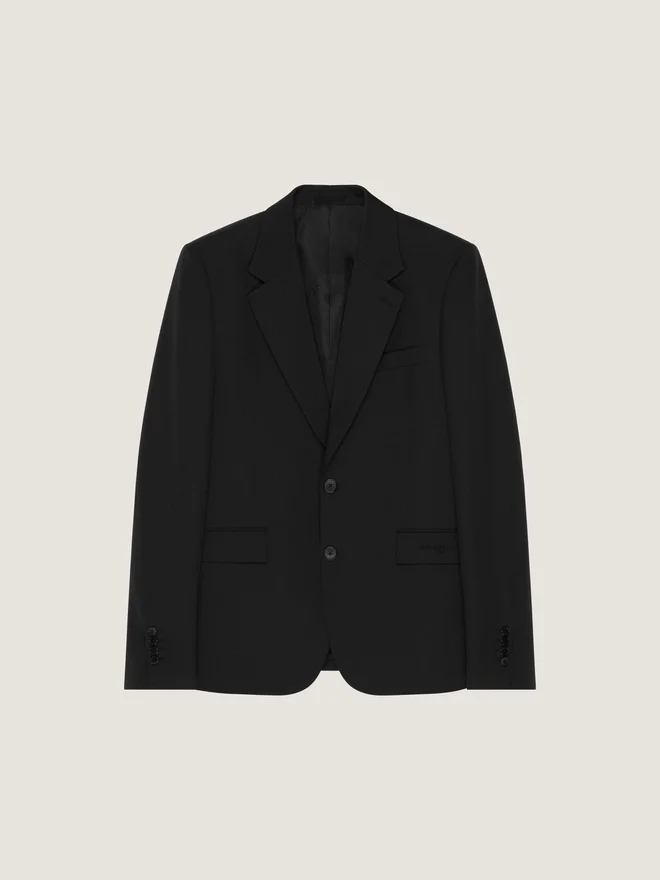 Eine gerade Silhouette mit Regular Fit und klarer Taillenlinie, die Struktur und Modernität in Einklang bringt.Strukturierte Jacke aus Wolle.Kragen mit Kerbe.Givenchy Paris-Jacquard auf der linken Pattentasche.Einreihig.Geknöpfte Manschetten.Eine Brusttasche.Zwei Pattentaschen vorne.• Regular Fit. • Futter mit durchgehendem Givenchy Paris-Jacquard. • Das Model ist 1,85 m groß und trägt Größe 48. • Farbe • Schwarz • Material • 100 % Wolle. Futter: 100 % Cupro. Ärmel-Futter: 100 % Viskose.Pflegehinweise • Nicht waschen • Bei maximaler Bügeleisentemperatur (110 °C) ohne Dampf bügeln • Nicht im Wäschetrockner trocknen • Nicht bleichen • Professionelle chemische Reinigung mit Tetrachlorethylen und Kohlenwasserstoffen, sehr schonende BehandlungHerkunftslandItalienProduktcodeBm30Kr16Dc-001 Pflegehinweise: Unsere Ateliers entwerfen mutig und kreativ einzigartige Kleidungsstücke aus hochwertigen Materialien.Um den Glanz Ihres Givenchy-Produkts zu bewahren, empfehlen wir, es in einem Staubbeutel aus Baumwolle an einem trockenen, kühlen Ort aufzubewahren. Für die meisten unserer Produkte wird eine chemische Reinigung empfohlen. Bitte beachten Sie unbedingt die Pflegehinweise auf dem Etikett Ihres Artikels. Besuchen Sie gerne unsere spezielle Seite oder wenden Sie sich direkt an unsere Givenchy-Teams, wenn Sie weitere Informationen wünschen.Nicht waschenBei maximaler Bügeleisentemperatur (110 °C) ohne Dampf bügelnNicht im Wäschetrockner trocknenNicht bleichenProfessionelle chemische Reinigung mit Tetrachlorethylen und Kohlenwasserstoffen, sehr schonende Behandlung