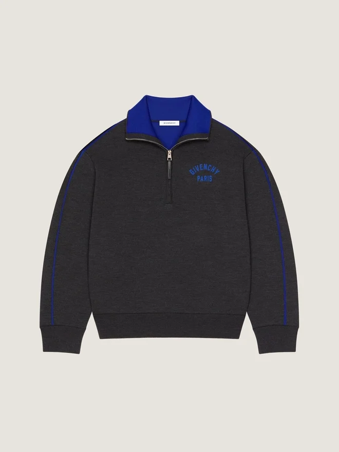 In Anlehnung an das Couture-Erbe von Givenchy zeichnen die geschwungenen, umgekehrten Nähte an Ärmeln und Hosenbeinen eine skulpturale Silhouette. Das „Givenchy Paris“-Logo greift Vintage-College-Elemente auf und interpretiert den klassischen Schriftzug durch dezente, kontrastreiche Stickapplikationen neu.Langärmeliger Pullover aus doppelseitiger Wolle.Hoher Reißverschlusskragen.Kontrastierender Givenchy Paris-Jacquard auf der Brust.Gerippter Saum und Ärmelbündchen.• Couture-Nähte für eine abgerundete Silhouette. • Kontrastfarbene Innenseite. PflegehinweiseNicht waschenNicht bügelnNicht im Wäschetrockner trocknenNicht bleichenChemische Reinigung mit KohlenwasserstoffenHerkunftslandItalienArtikelnummerBm90W14Ynu-063