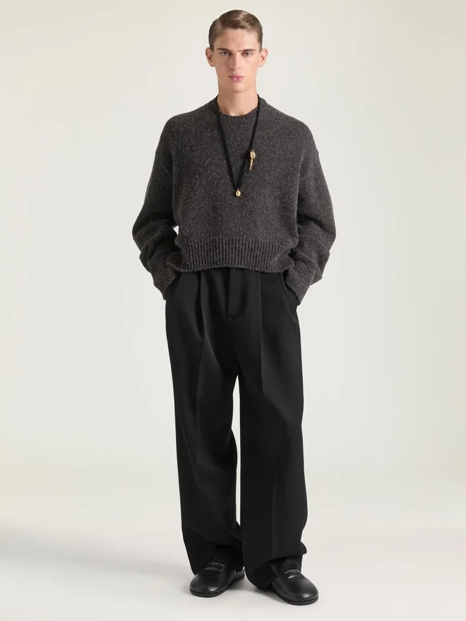 In Anlehnung an das Couture-Erbe von Givenchy ziehen geschwungene, umgekehrte Nähte an Ärmeln und Hosenbeinen verlaufende Linien und schaffen so eine skulpturale Silhouette.