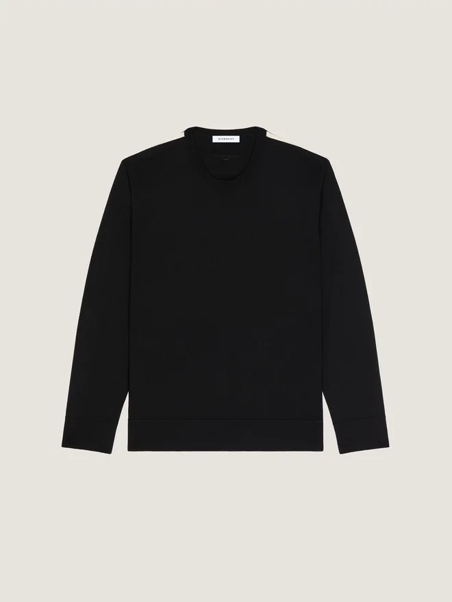 Das Givenchy-Label wird zu einem dezenten Schmuckelement, das auf die Kleidungsstücke geprägt, aufgenäht oder aufgestickt ist. Langärmeliger Pullover aus
