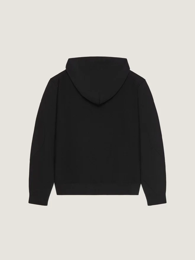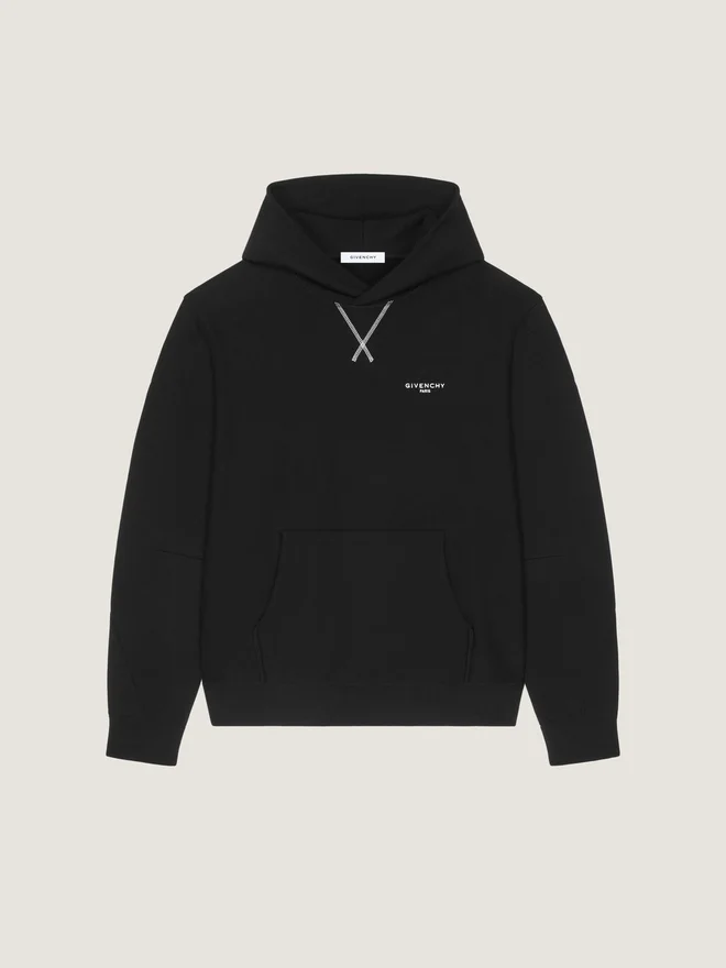 In Anlehnung an das Couture-Erbe von Givenchy ziehen sich geschwungene, umgekehrte Nähte an Ärmeln und Hosenbeinen entlang und schaffen so eine skulpturale Silhouette. Das Givenchy Paris-Logo greift Vintage-College-Referenzen auf und interpretiert klassische Schriftzüge in subtilen, kontrastierenden Stickapplikationen neu. • Langärmliges Kapuzensweatshirt aus Fleece. • Kleines Givenchy Paris-Logo auf der Brust gestickt. • Kontrastierende Ziernähte auf der Vorderseite. • Kordelzug an der Kapuze. • Eine Kängurutasche auf der Vorderseite. • Gerippter Saum und Ärmelbündchen.• Couture-Nähte für eine abgerundete Silhouette. • Lockere Passform. • Das Model ist 1,85 m groß und trägt Größe M. Farbe Schwarz Material 100 % Baumwolle.Pflegehinweise- Waschen bei maximal 30 °C, Schonwaschgang- Bügeln bei maximaler Bügeleisentemperatur (110 °C) Ohne DampfNicht im Wäschetrockner trocknenNicht bleichenNicht chemisch reinigenHerkunftslandPortugalProduktcodeBmj0Nh3Ys1-001 Pflegehinweise: In unseren Werkstätten entwerfen wir mutig und kreativ einzigartige Kleidungsstücke, die aus hochwertigen Materialien gefertigt sind. Um die Schönheit Ihres Givenchy-Produkts zu bewahren, empfehlen wir, es in einem Staubbeutel aus Baumwolle an einem trockenen, kühlen Ort aufzubewahren. Für die meisten unserer Produkte wird eine chemische Reinigung empfohlen. Bitte beachten Sie unbedingt die Pflegehinweise auf dem Etikett Ihres Artikels. Besuchen Sie gerne unsere spezielle Seite oder wenden Sie sich direkt an unsere Givenchy-Teams, wenn Sie weitere Informationen wünschen.Maximal 30 °C, SchonwaschgangBei maximaler Bügeleisentemperatur (110 °C) ohne Dampf bügelnNicht im Wäschetrockner trocknenNicht bleichenNicht chemisch reinigen
