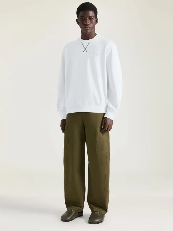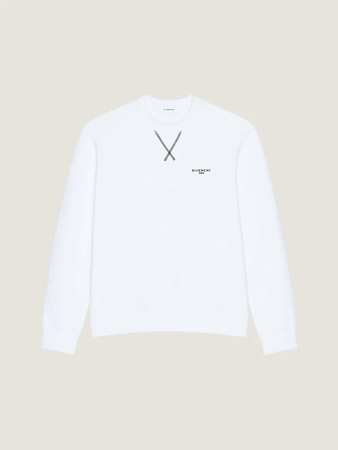 In Anlehnung an das Couture-Erbe von Givenchy ziehen geschwungene, umgekehrte Nähte an Ärmeln und Hosenbeinen verlaufende Linien und schaffen so eine skulpturale Silhouette. Das Givenchy Paris-Logo greift Vintage-College-Referenzen auf und interpretiert klassische Schriftzüge in subtilen, kontrastreichen und gestickten Applikationen neu.Langärmliges Sweatshirt aus Fleece.Rundhalsausschnitt.Kleines Givenchy Paris-Logo auf der Brust gestickt.Gerippter Kragen, Saum und Ärmelbündchen.• Couture-Nähte für eine abgerundete Silhouette. • Lockere Passform. • Das Model ist 1,85 m groß und trägt Größe M.Pflegehinweise- Waschen bei maximal 30 °C, Schonwaschgang- Bügeln bei maximaler Bügeleisentemperatur (110 °C) Ohne DampfNicht im Wäschetrockner trocknenNicht bleichenNicht chemisch reinigenHerkunftslandPortugalArtikelnummerBmj0P63Ys1-100 Pflegehinweise: In unseren Werkstätten entwerfen wir mutig und kreativ einzigartige Kleidungsstücke, die aus hochwertigen Materialien gefertigt sind. Um die Schönheit Ihres Givenchy-Produkts zu bewahren, empfehlen wir, es in einem Baumwoll-Staubbeutel an einem trockenen, kühlen Ort aufzubewahren. Für die meisten unserer Produkte wird eine chemische Reinigung empfohlen. Bitte beachten Sie unbedingt die Pflegehinweise auf dem Etikett Ihres Artikels. Besuchen Sie gerne unsere spezielle Seite oder wenden Sie sich direkt an unsere Givenchy-Teams, wenn Sie weitere Informationen wünschen.Maximal 30 °C, SchonwaschgangBei maximaler Bügeleisentemperatur (110 °C) ohne Dampf bügelnNicht im Wäschetrockner trocknenNicht bleichenNicht chemisch reinigen