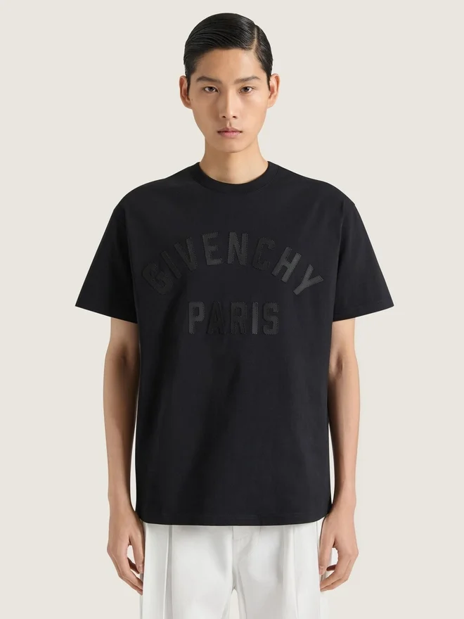 Das Givenchy Paris-Logo greift Vintage-College-Referenzen auf und interpretiert klassische Schriftzüge in subtilen, kontrastreichen und gestickten Applikationen neu. Kurzärmeliges T-Shirt aus Baumwolle.• Rundhalsausschnitt. • Givenchy Paris-Aufnäher aus Grosgrain mit Zickzack-Stickerei auf der Vorderseite. • Das Model ist 1,85 m groß und trägt Größe M. Farbe Schwarz Material 100 % Baumwolle.Pflegehinweise- Waschen bei maximal 30 °C, Schonwaschgang- Bügeln bei maximaler Bügeleisentemperatur (110 °C) Ohne DampfNicht im Wäschetrockner trocknenNicht bleichenNicht chemisch reinigenHerkunftslandPortugalArtikelnummerBm71Nk3Yrs-001 Pflegehinweise: In unseren Werkstätten entwerfen wir mutig und kreativ einzigartige Kleidungsstücke, die aus hochwertigen Materialien gefertigt sind. Um die Schönheit Ihres Givenchy-Produkts zu bewahren, empfehlen wir, es in einem Staubbeutel aus Baumwolle an einem trockenen, kühlen Ort aufzubewahren. Für die meisten unserer Produkte wird eine chemische Reinigung empfohlen. Bitte beachten Sie unbedingt die Pflegehinweise auf dem Etikett Ihres Artikels. Besuchen Sie gerne unsere spezielle Seite oder wenden Sie sich direkt an unsere Givenchy-Teams, wenn Sie weitere Informationen wünschen.Maximal 30 °C, SchonwaschgangBei maximaler Bügeleisentemperatur (110 °C) ohne Dampf bügelnNicht im Wäschetrockner trocknenNicht bleichenNicht chemisch reinigen