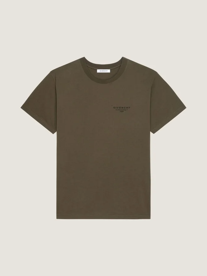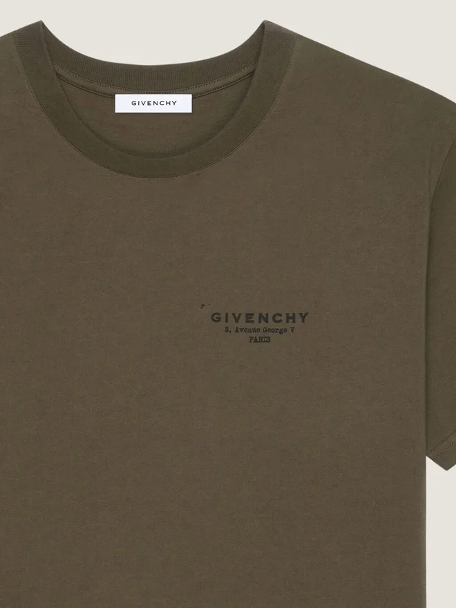 Der Givenchy-Stempel ist ein authentisches Motiv, das von Einladungen zu Haute-Couture-Shows im historischen Hotel Caraman, 3 Avenue George V, dem Pariser Stammhaus von Givenchy, stammt. Kurzärmeliges T-Shirt aus Baumwolle. Rundhalsausschnitt.• Givenchy-Stempel auf der Brust aufgedruckt. Ohne DampfNicht im Wäschetrockner trocknenNicht bleichenNicht chemisch reinigenHerkunftslandPortugalArtikelnummerBm71Nk3Yrv-305 Pflegehinweise: In unseren Werkstätten entwerfen wir mutig und kreativ einzigartige Kleidungsstücke, die aus hochwertigen Materialien gefertigt sind. Um die Schönheit Ihres Givenchy-Produkts zu bewahren, empfehlen wir, es in einem Staubbeutel aus Baumwolle an einem trockenen, kühlen Ort aufzubewahren. Für die meisten unserer Produkte wird eine chemische Reinigung empfohlen. Bitte beachten Sie unbedingt die Pflegehinweise auf dem Etikett Ihres Artikels. Besuchen Sie gerne unsere spezielle Seite oder wenden Sie sich direkt an unsere Givenchy-Teams, wenn Sie weitere Informationen wünschen.Maximal 30 °C, SchonwaschgangBügeln bei maximaler Bügeleisentemperatur (110 °C) ohne DampfNicht im Wäschetrockner trocknenNicht bleichenNicht chemisch reinigen