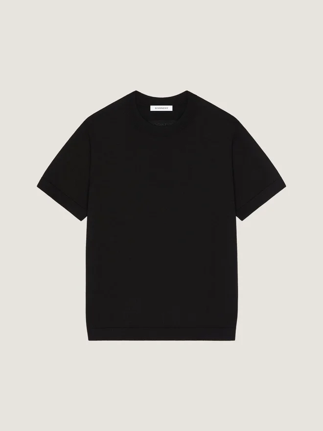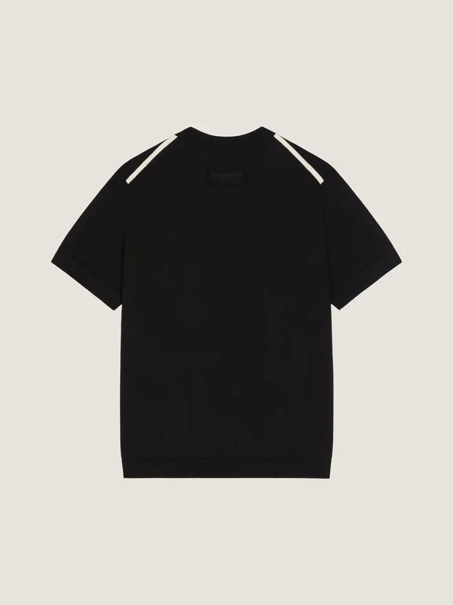 Das Givenchy-Label wird zu einem dezenten Schmuckelement, das auf die Kleidungsstücke geprägt, aufgenäht oder aufgestickt ist. Kurzärmeliges T-Shirt aus