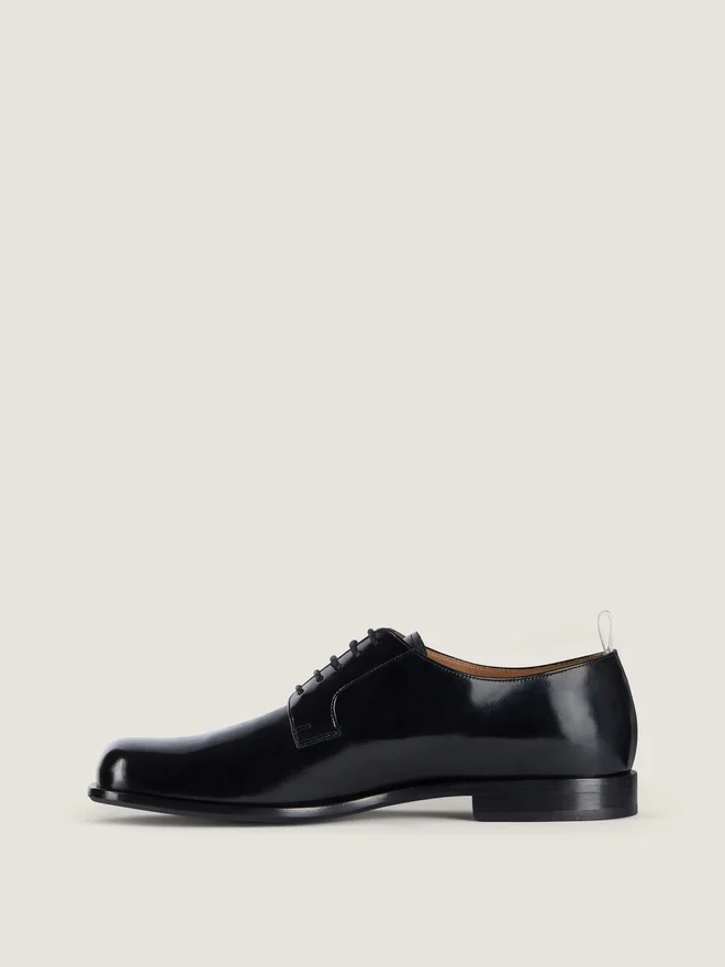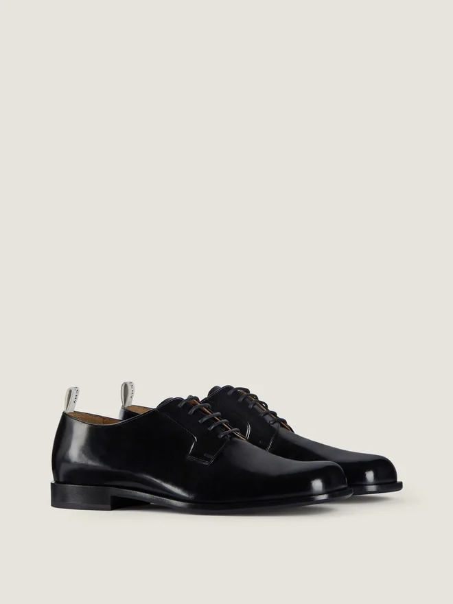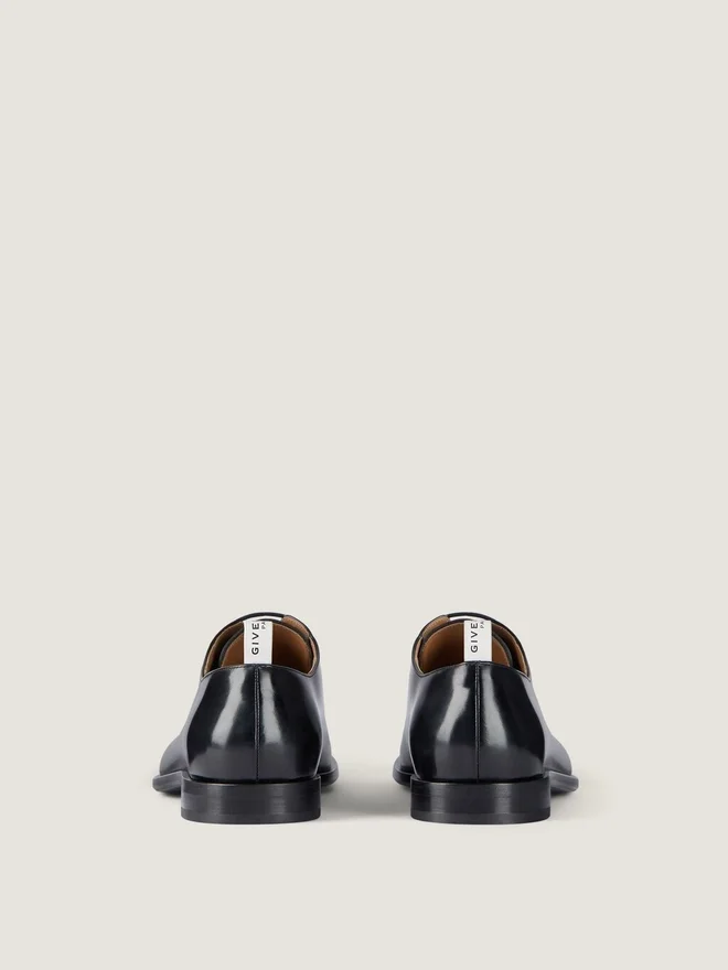 Derby-Schuhe aus gebürstetem Rindsleder. Tux-Linie. Lederschlaufe mit Grosgrain-Effekt und Givenchy Paris-Signatur. Goldene Givenchy
